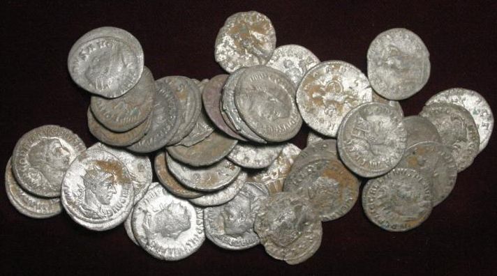 diese Münzen aus der Mitte des 3. Jahrhunderts stammen von einem Freund von mir, wurden angeblich gemeinsam (ich gehe davon aus, dass es stimmt) vor Jahren auf einem Feld gefunden. Material ist bei den früheren Prägungen Silber bzw. bei Valerian und Gallienus eher eine Silberlegierung. Die Frage ist nun, wie kann man diese Münzen reinigen? Alle sind mit einer Art sehr trockenem rötlichen Lehm überzogen. Dieser lässt sich zwar mit dem Fingernagel wegkratzen, aber auch nur mit erheblichem Druck.