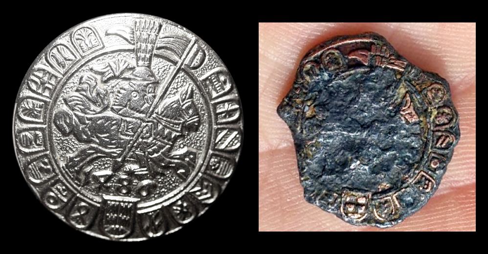 Ein Trachtenknopf mit Münz-Motiv "Ritter und Fahne im Wappenkreis". Das untere Bild ist um 90 Grad rechts zu drehen, dann ist die Fahne oben. Bild kann ich vielleicht nachliefern. Meine Knöpfe habe ich noch nicht fotografiert.