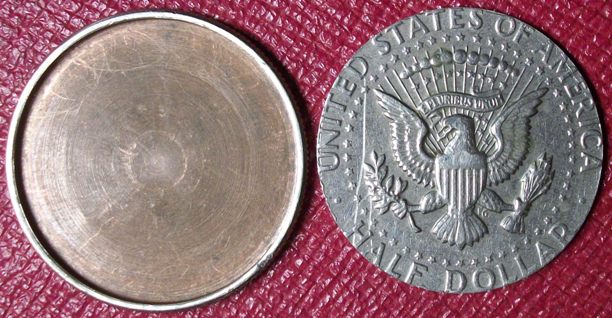 The reverse has been cut out of the coin and its insides have been removed, but it hasn’t been converted into a “box.” There is no hollow place, no empty space. Turning over the “reverse” piece reveals....