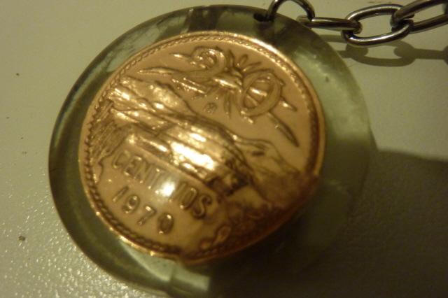 Two oder three years ago I was in Mexico Ciudad. My old key fob was broken. In the near of the Zocalo I found a street hawker, who sells Mexican coins in plexiglass or synthetik resin as key fobs. I decided to buy the pyramide coin, year 1970. Unfortunatly my bunch of keys is fallen more then once. So the Plexiglass is broken a little bit. But I hope to use the key fob some years more.
