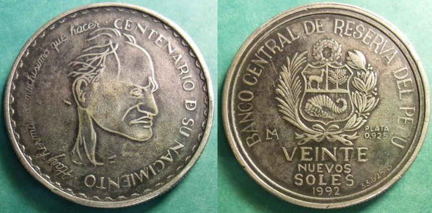 20 Nuevos Soles, 1992 geprägt in Lima zum 100. Geburtstag des Schriftstellers César A. Vallejo