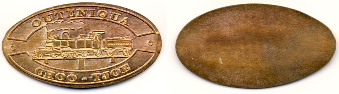 Die Abmessungen des vorgestellten Stückes sind übrigens 4,68 Gramm und 22,4 x 41,5 mm. Fragt mich bitte nicht, welche Basismünze dem Quetschie zugrunde liegt. Vom Gewicht her käme ein südafrikanisches 5Cent-Stück in Frage, aber das ist aus Kupfer-plattiertem Stahl. Mein schöner Outeniqua ist allerdings nicht magnetisch. Vielleicht werden ja besondere Ronden in dem Automaten verwendet. Z-Mann, der Spezialist zu diesem Thema hier im Cafe, kann möglicherweise mehr dazu sagen.
