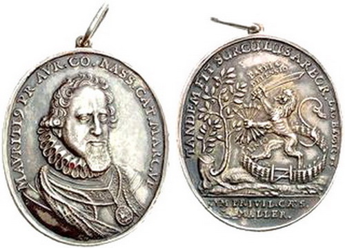 Text zu der ersten Medaille.: Ovale Silbermedaille o.J. (1599) von Chr. Maler, a.d. Vereinigten Niederlande. Brb. des Statthalters Moritz von Oranien, Graf von Nassau-Dillenburg, im Harnisch nach halbr. / Löwe mit Pfeilbündel und Schwert in einem Zaun n.l., davor austreibendes Orangenbäumchen. v. Loon -, KPK 504. Slg. Erl. -. 35 x 41 mm, 21,30 g