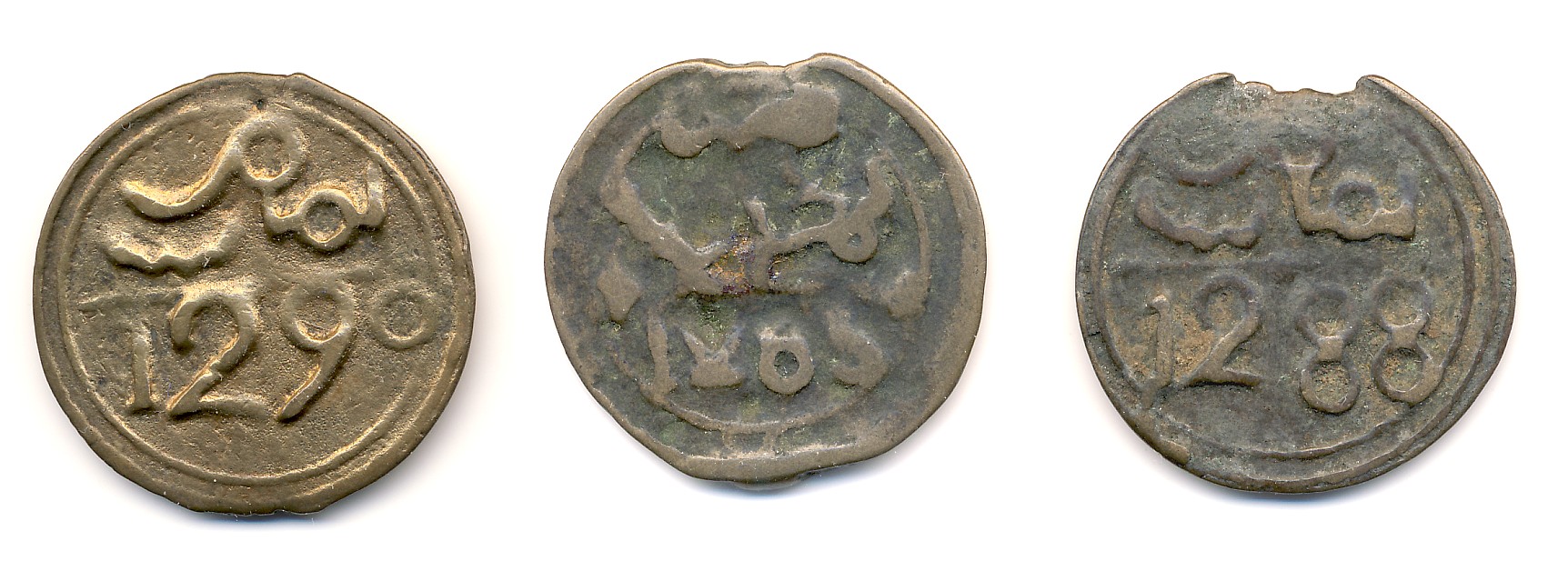 Die oberen beiden sind Stücke des zweiten Standards unter Sidi Muhammad IV. zu 4 Falus aus Marrakesch (1288 und 1285). Das zweite ist bei einem Sollgewicht von 11,5 g stark untergewichtig, aber durch den Durchmesser (im Schnitt 27-29 mm) eindeutig noch als Stück zu 4 Falus zu sehen. Der Durchmesser ist bei gegossenen Bronzemünzen - anders als bei Silbermünzen, die im Zweifel nach Gewicht bewertete wurden - immer aussagekräftiger, als das Gewicht.
