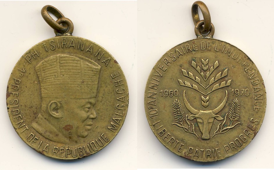 Die folgende Medaille aus dem Jahr 1970 feiert die 10-jährige Unabhängigkeit der Republique Malgache, wie Madagaskar damals hieß. Sie zeigt den Kopf von Philibert Tsiranana (1912 - 1978), der von 1960 - 1972 der 1. Präsident Madagaskars war.