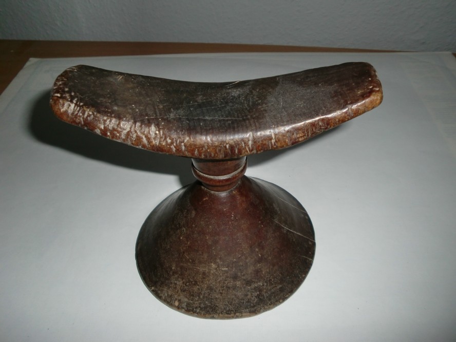Es handelt sich um eine Schlafstütze, wie sie von somalischen Beduinenvölkern benutzt wurden. Diese sind im heutigen Somalia, dem nördlichen Kenia und dem südlichen Äthiopien angesiedelt. Ich möchte nicht ausschließen, daß solche Teile hier und da immer noch Verwendung finden. Vor allem die somalischen Herren sind sehr eitel und möchten Ihren Kopfschmuck während der Nacht nicht dadurch zerstören, daß sie ihr Haupt mit der aufwändig gestylten Haarpracht auf ein Kissen oder sogar auf den blanken Grund legen. Deshalb wurden solche Nackenstützen entwickelt, an die man sich sicherlich gewöhnen muß. Aber immerhin bleibt die Frisur korrekt. Ausprobiert habe ich das Ding noch nicht…