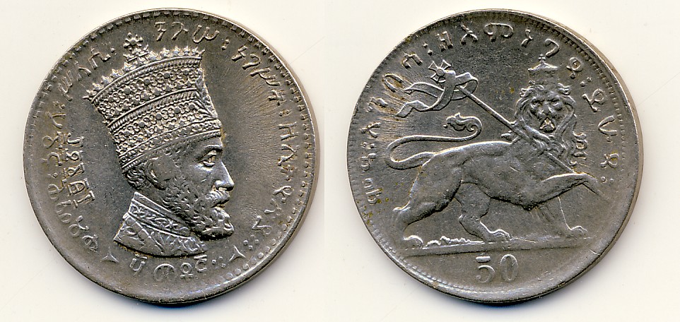 2. eine Münze zu 50 Santeem aus der Zeit von Kaiser Haile Selassie I aus Nickel (S #27 / KM #31).