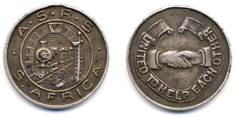 Auf der Vorderseite sieht man einen Dampflok-bespannten Zug und die Umschrift "ASRS S. AFRICA, auf der Rückseite zwei sich reichende Hände, ein Motiv, das irgendwie von den Löwen-Münzen Sierra Leones aus dem späten 18. Jahrhundert abgeguckt zu sein scheint.