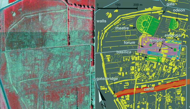 Photo: Aerial images of the ancient city of Altinum (left) were processed by a team at the University of Padua to reveal the layout of a Roman trading center (right).