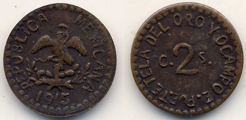 Die zweite stammt aus dem Staat Puebla aus Tetela del Oro y Ocampo, eine republikanische Münze aus einem Staat, in dem aber auch Zapata und Maduro gelegentlich durchzogen. (KM #759).