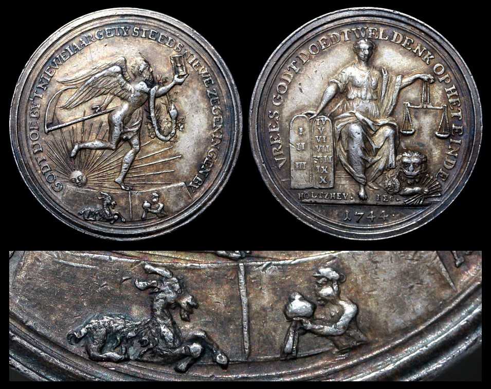 Rv. Die holländische Magd mit den Tafeln der Zehn Gebote und Waage sitzt frontal, zu ihren Füßen der holländische Wappenlöwe mit Pfeilbündel. Umschrift: VREES GODT DOEDT WEL DENK OP HET ENDE (Fürchte Gott, handle gut, bedenk das Ende) Auf der Standlinie HOLTZHEY FEC. Exergue 1744. v. Loon CLXXXIII(183), Pl. XX, Ag, 34 mm; 13,5 g.