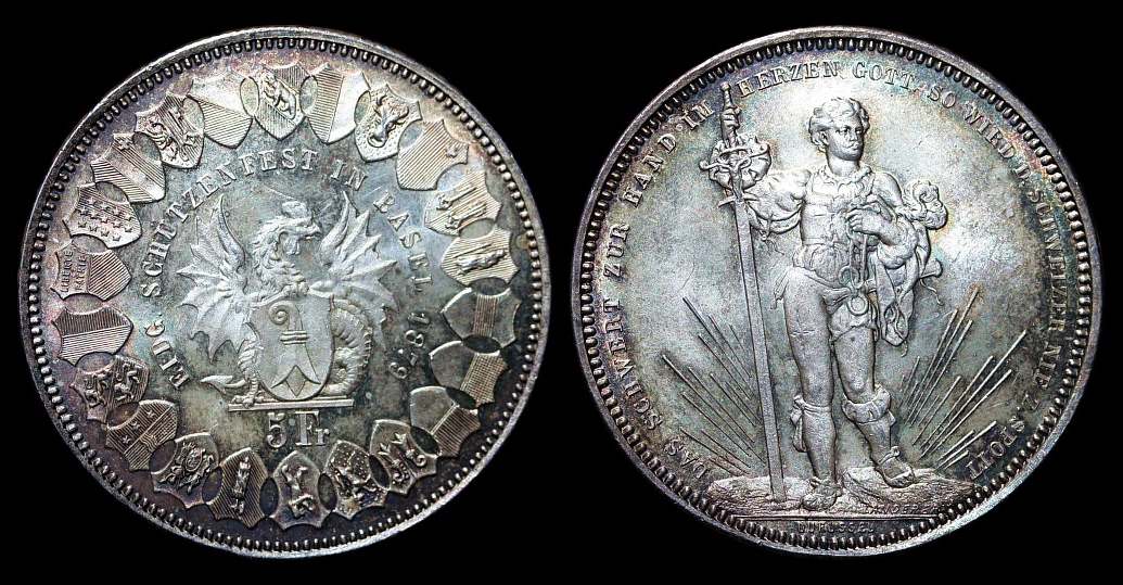 Basel, 5 Franken 1879, Schützenfest in Basel (Ag, 0.900,37 mm, 25 g). Av. Basilisk, den Wappenschild von Basel haltend, umrahmt von den Schilden der 22 Kantone. Rv. Vor Morgenstrahlen Schweizer mit mannshohem Schwert (Bidenhänder). Umschrift DAS SCHWERT ZUR HAND, IM HERZEN GOTT, SO WIRD DER SCHWEIZER NIE ZUM SPOTT. Exergue: Signatur (Edouard) DURUSSEL. Schön S14, Dav. 388, Divo S14, HMZ 1252.
