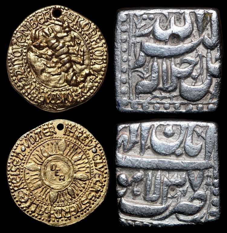 Anm. Ich als nicht seriöser Sammler, der auch vor PP nicht zurückschreckt, habe sie übrigens auch nicht.) Der komplette Zodiac hat jedoch seinen Weg auf eine extrem seltene Serie indischer Münzen gefunden, die in Verbindung mit einer Kalender-Reform im 16. Jh. verausgabt wurde.