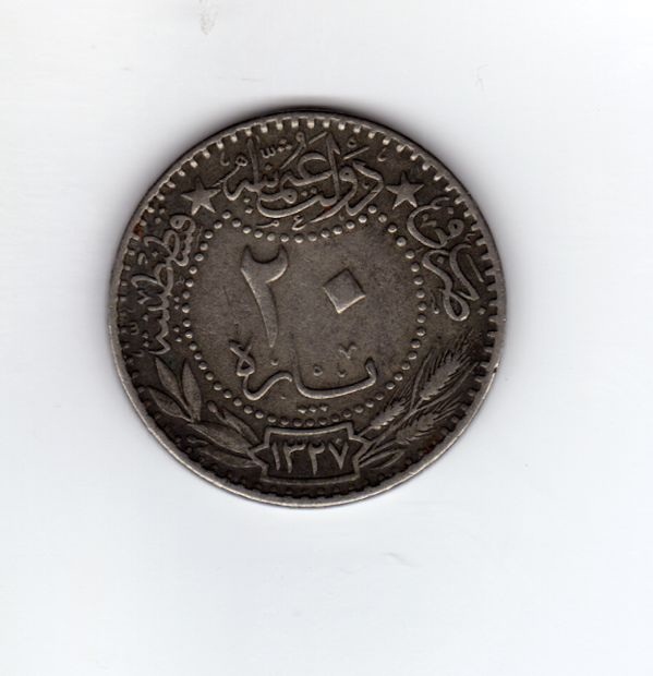 das Stück stammt aus dem Osmanischen Reich (Heute Türkei) und ist ein 20-Para-Stück von 1911 (1327 AH = 1909 AD, Jahr der Thronbesteigung + 3. Regierungsjahr = 1911 AD).