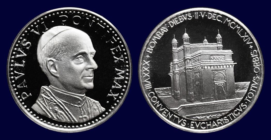 Paul VI. 1963-1978. Medaille o.J. auf seine Reise zum Eucharistischen Weltkongress in Bombay im Dezember 1964 (lt. lamoneta.it Opus Costantino Affer). Av. PAVLVS VI. PONT MAX Büste leicht r. mit Berretto, Mozzetta und Stola, o. Signatur / Rv. XXXVIII CONVENTVS EVCHARISTICVS TOTIVS ORBIS + BOMBAY DIEBVS II V DEC MCMLXIV Ansicht der „Porta di Bombay“. Silber, 29,5 mm, 13,05 g. Macrí-Marinelli 149.