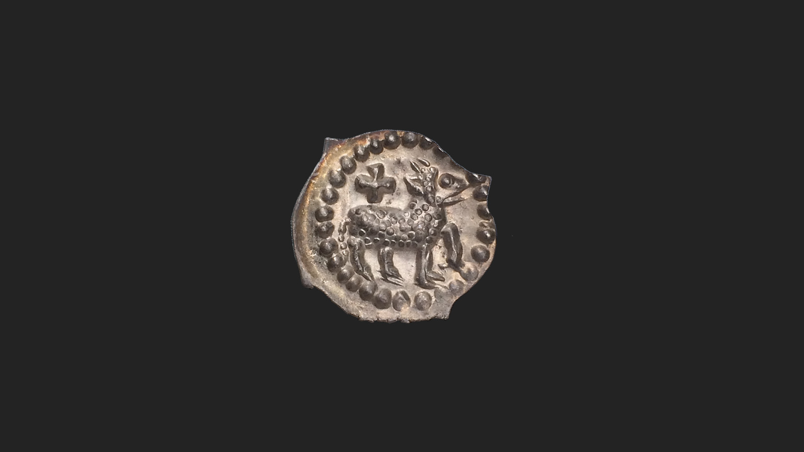Vierzipfliger Pfennig, Schaffhausner Brakteat, um 1250Lamm nach rechts schreitend, darüber gleichschenkliges Kreuz, im Perlkreis.