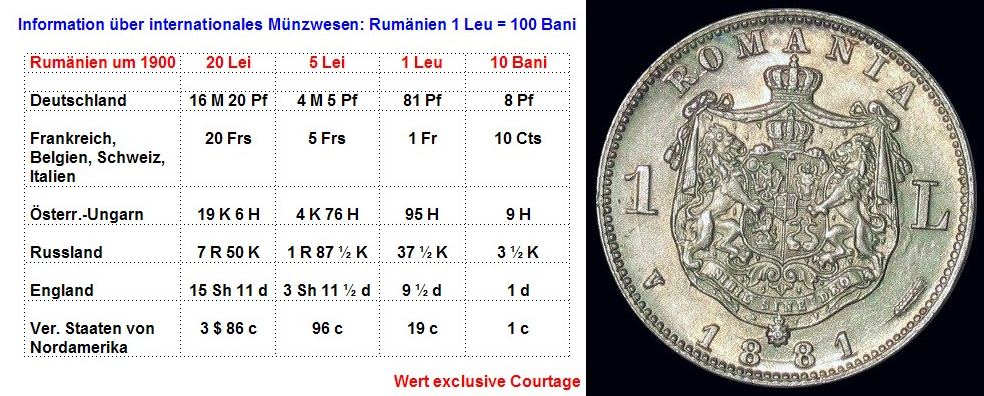 Die Unabhängigkeit Rumäniens wurde 1878 auf dem Berliner Kongress bestätigt, nachdem der russisch-türkische Krieg von 1877 / 1878 beendet war. Bald darauf (1881) folgte die Proklamation des Königreichs und das Wappen wurde erweitert. Es zeigte nun zusätzlich zu den bisherigen Wappen einen steigenden Löwen auf einer Krone (Oltenien und Banat) und zwei gegeneinandergestellte Delfine (Dobrudscha am Schwarzen Meer). Für diejenigen, die es interessiert, habe ich mal die Wechselkurse des Leu zu den damals gängigen Währungen neben das Wappen gestellt.