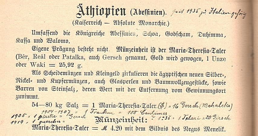 Da die Minze Roma Maria Theresa Thalers (bei einer anderen Durchmesser und Silber Feinheit als andere) für die Verwendung in Äthiopien geprägt, würde diese vielleicht als italienischen Münzen zu qualifizieren. Die Italiener demonetized dann die MTT in Äthiopien 1938, aber weiterhin, dass die Thalers Handel bei 30 Lire auf dem Schwarzmarkt bis die Briten Ihnen remonetized, nachdem die Italiener vertrieben worden waren.