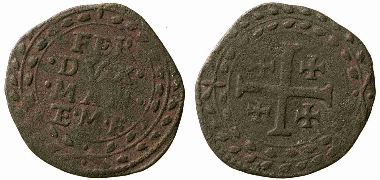 Nel campo: •FER • •DVX • •MAN • •ET M F • su quattro righe entro corona d'alloro, formata da due rami annodati in a. e in b. Croce di Gerusalemme, entro corona di alloro formata da due rami annodati in a. e in b.