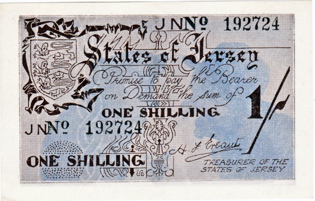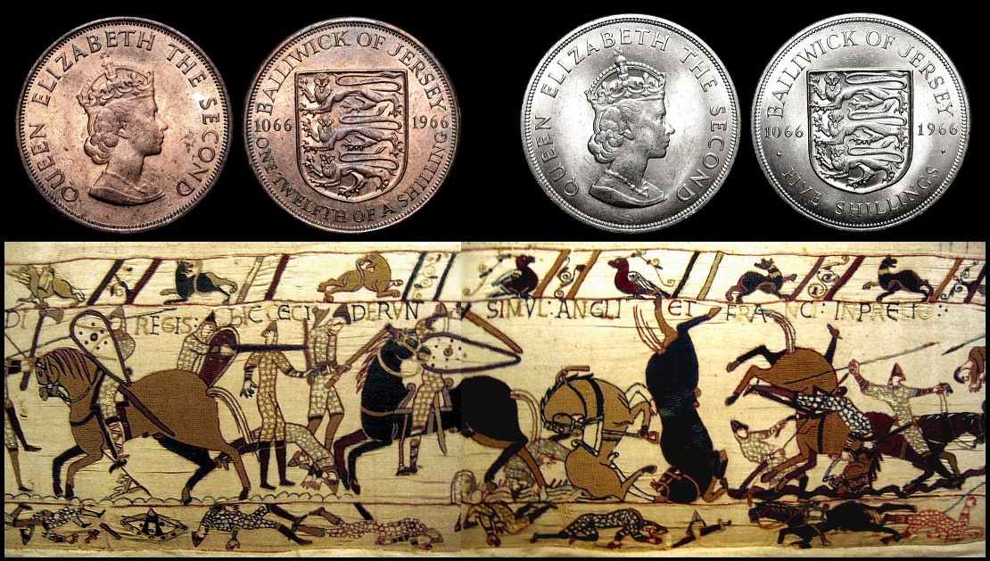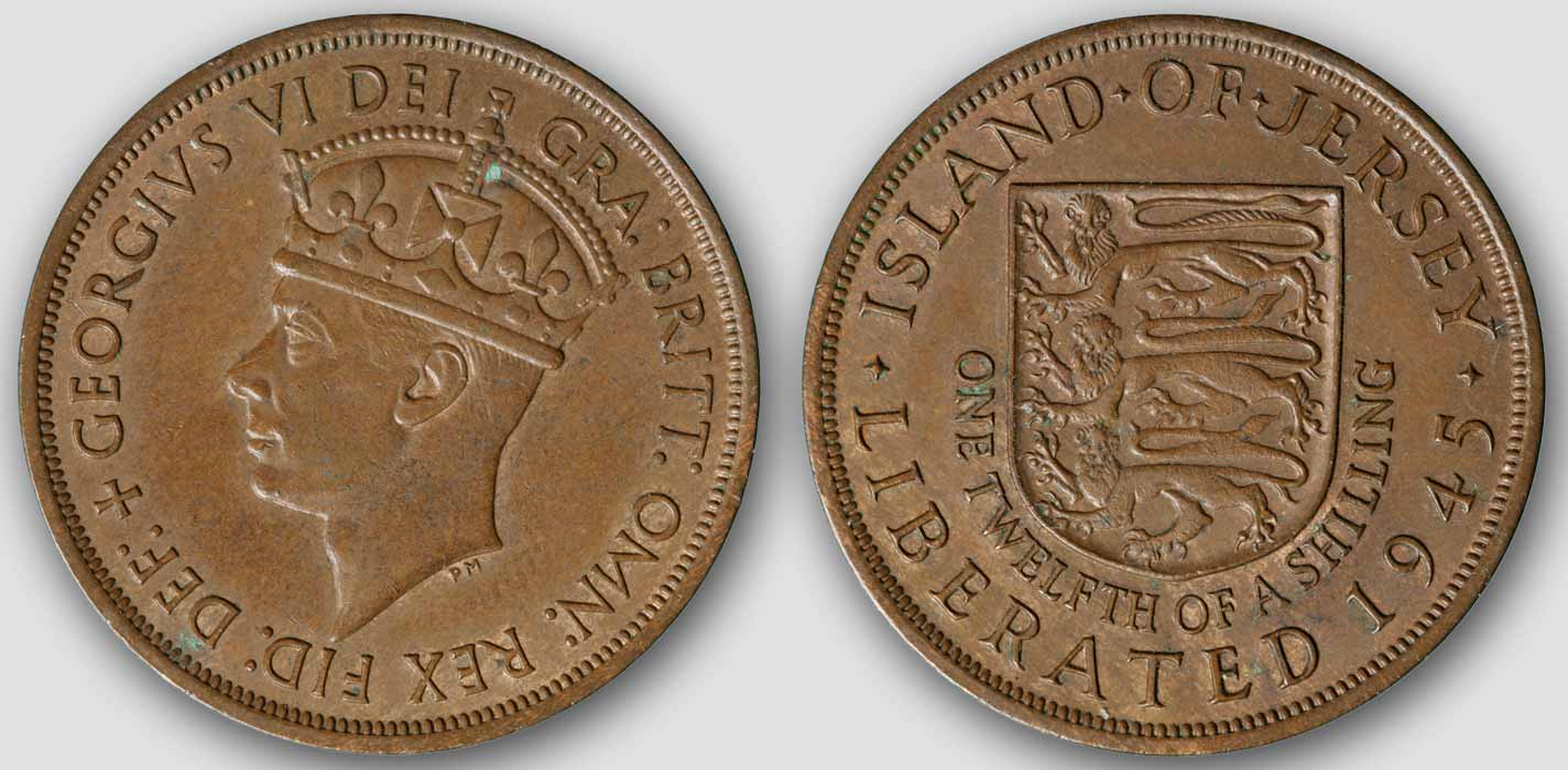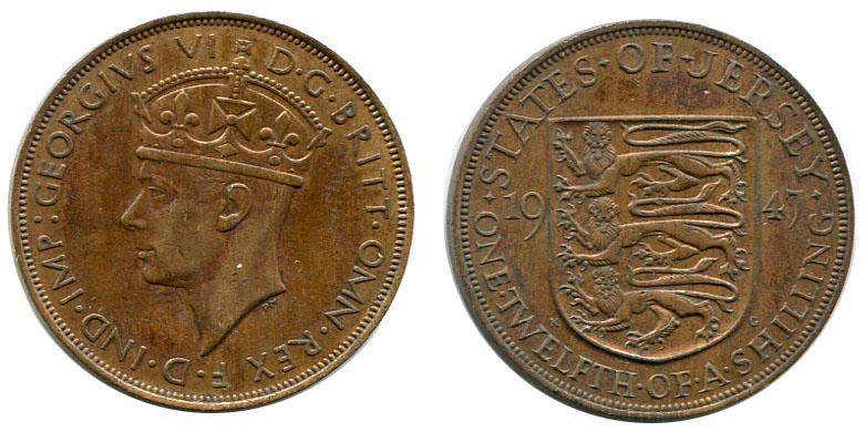Ich möchte dazu ein kleines Münzlein aus Jersey zeigen, ein Zwölftel eines Shillings, das auf der Vorderseite den regierenden König Englands und Herzog der Normandie zeigt, Georg VI.