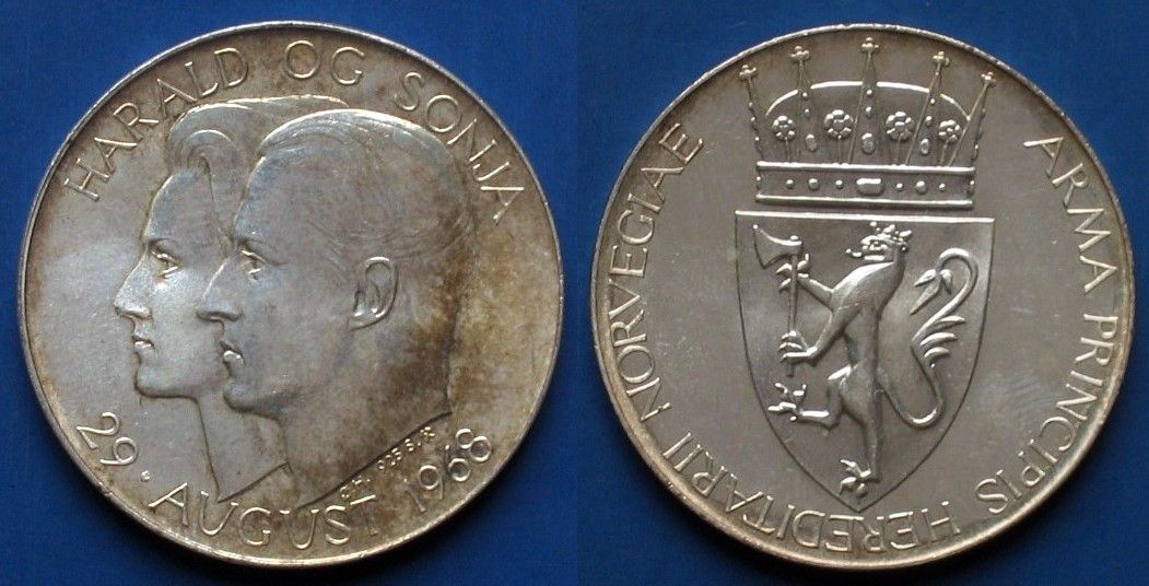 Da die meisten modernen norwegischen Münzen bekannt sein dürften, zeige ich hier zur Abwechslung eine - vermutlich weniger bekannte (?) - Medaille auf die Hochzeit des gegenwärtigen norwegischen Königspaars aus dem Jahr 1968.