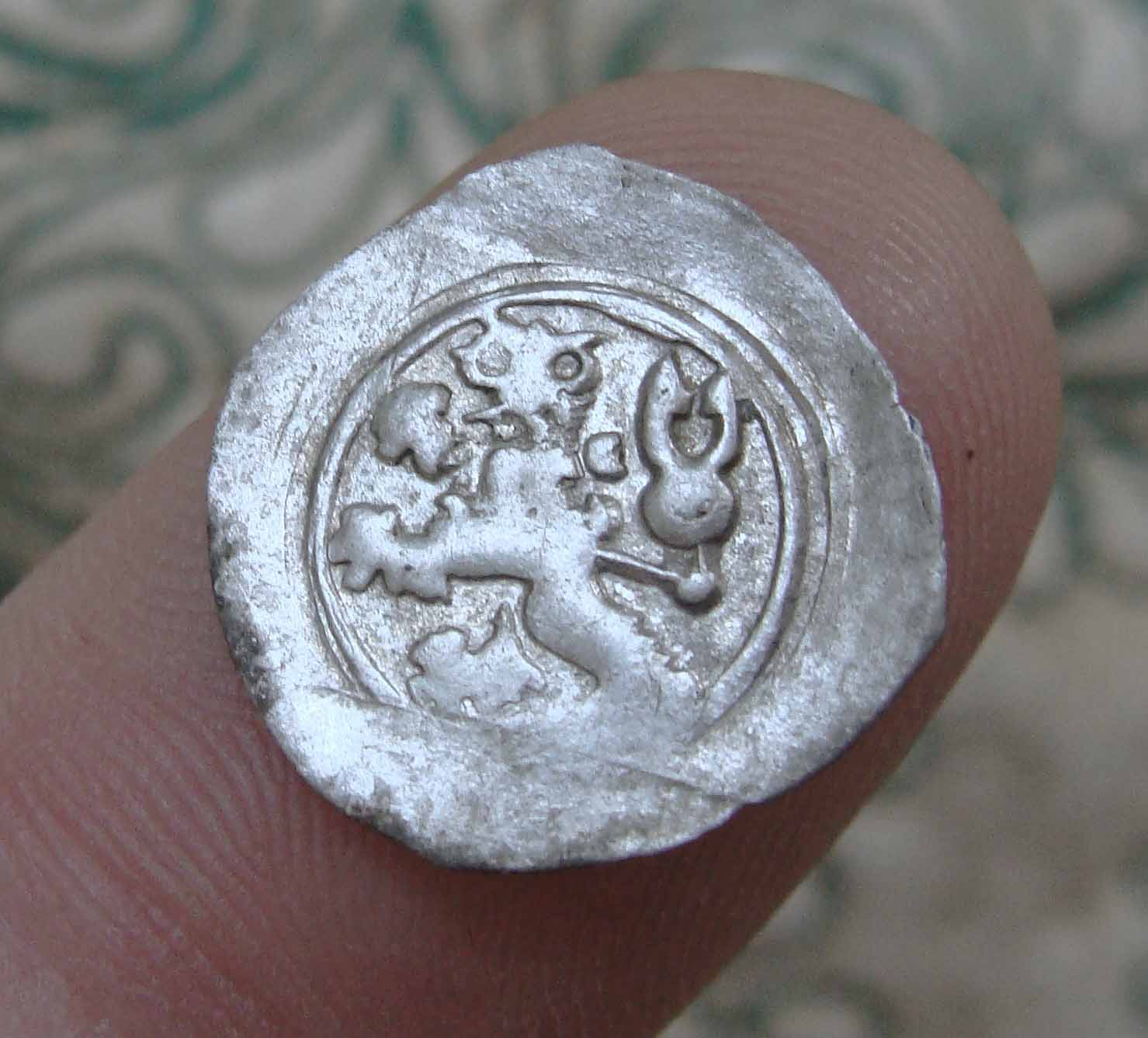 Es handelt sich hierbei eindeutig um gotische böhmische Gepräge, höchstwahrscheinlich aus der Zeit der Hussitenkriege (30. Juli 1419 – 30. Mai 1434)? Als einziges Prägebild der steigende böhmische Löwe nach links und angeblich aus Kirchensilber geprägt?