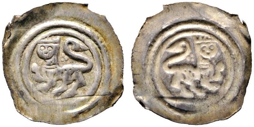 BAMBERG, BISTUM, Heinrich I. von Schmiedefeld, 1242-1258, Pfennig. Löwe m.gekröntem Menschenkopf l. Rs.Undeutlich. 0,41g. Krug 84, ss+