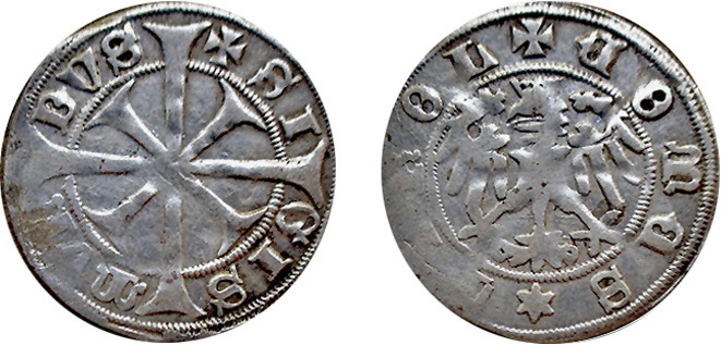 Im Jahre 1477 ging die Prägetätigkeit in der Münze Meran zu Ende, und wurde nach Hall in Tirol verlegt. Gerätschaften, Materialien sowie auch ein Teil des Personals wurden bis Ende des Jahres nach Hall verbracht bzw. übersiedelt. In Hall wurde die Prägung ausgeweitet, und auch das Münzpersonal aufgestockt. Und ab da sind die Typen M605 bis M608 nicht 100%ig genau zuzuordnen. Laut Rizzolli gab es sowohl Stempelkopplungen, zudem verwendeten die Stempelschneider Peck und Michlfelder (dieser war in Hall ab 1477 wieder tätig), ihre alten Punzen natürlich weiter. Es gibt wohl Unterscheidungsmerkmale, die sich aus der Silberzusammensetzung ablesen lassen (höherer Nickelanteil des in Meran verprägten Silbers), da der normale Sammler aber wohl kaum auf Röntgenfluoreszenzanalysen und Elektronenrastermikroskope usw. zurückgreifen kann, würde ich als Sammler diese Stücke trotzdem als Meraner Prägungen einstufen.