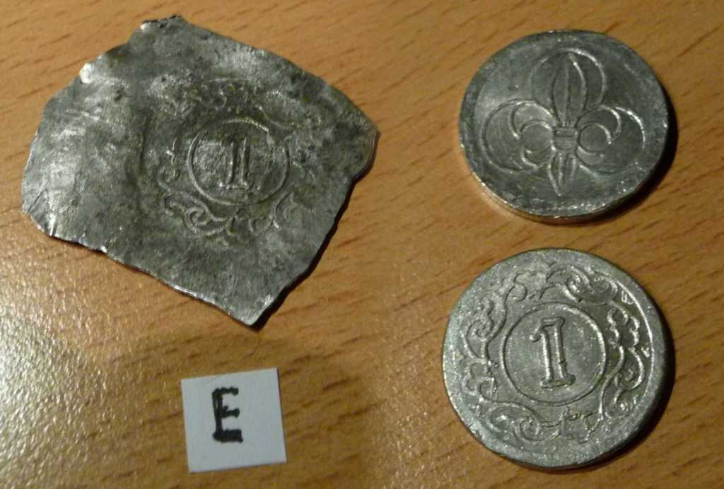 Ich habe Prägeversuche mit Schrötlingen aus Aluminiumblech gemacht und füge hier einige Bilder an, die meine Vermutungen bestätigen. Ein befreundeter Graveur hat mir einige Stempel gefertigt, die ich zur Münzprägung für meine Pfadindergruppe (Lagergeld) verwendet habe. Als Münzmetall verwendete ich damals Zinn. Diese Equipment habe ich hier für meine Veruche verwendet.