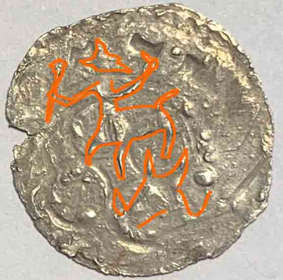 Während die Rückseite den meisten hier bereits gezeigten Exemplaren gleicht, sind die Ringelbeizeichen am Avers etwas anders angeordnet. Die Ringel beiderseits der Türme finden sich auch auf einem anderen Beleg, aber das dritte obere Ringel links neben dem kleinen Finger der aufragenden Hand hatten wir bisher noch nicht. Bei meinem, auf der Seite 11 hier in diesem Leitfaden gezeigten Stück findet sich das obere Ringelbeizeichen zwischen Daumen und Zeigefinger der aufragenden Hand.