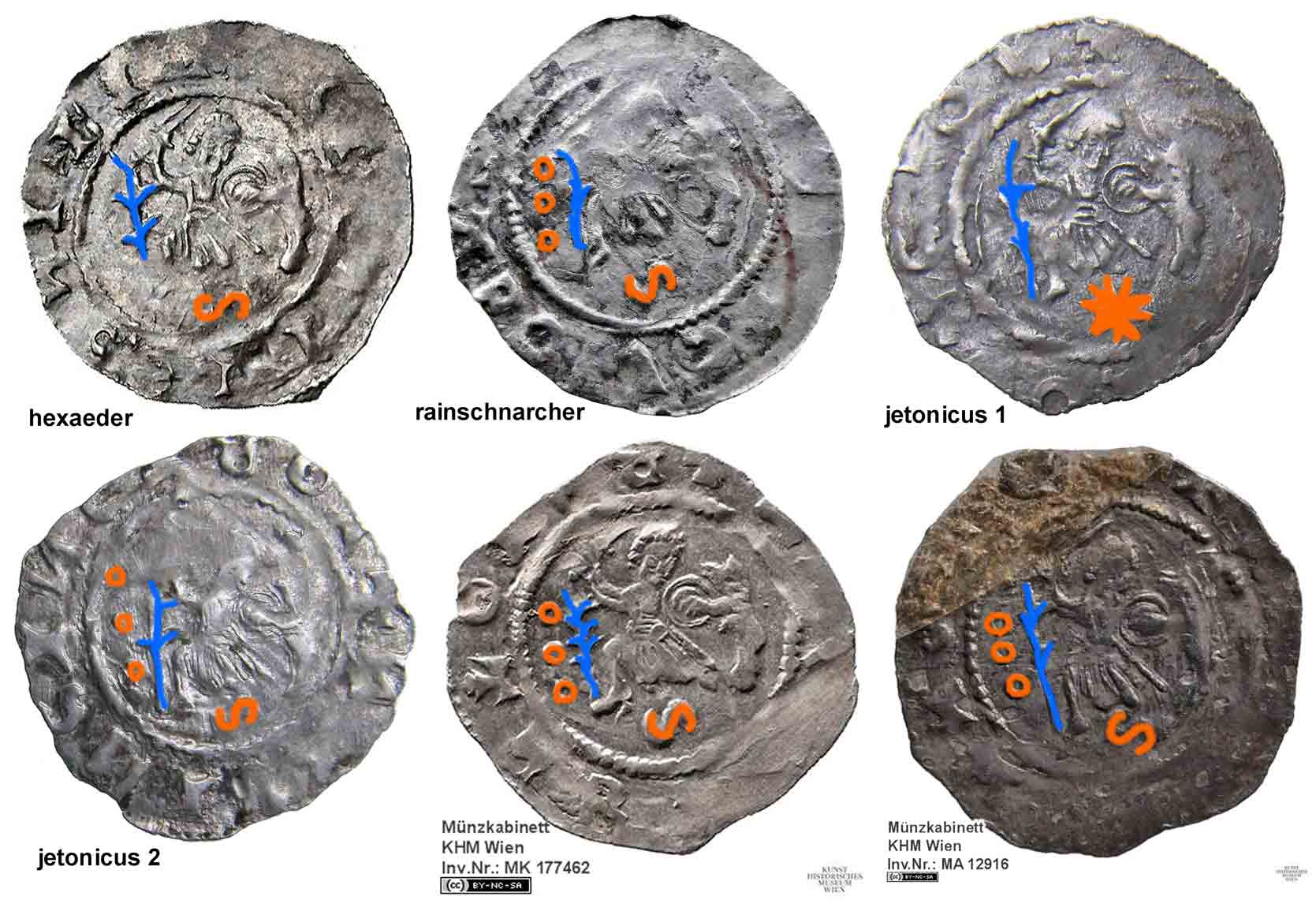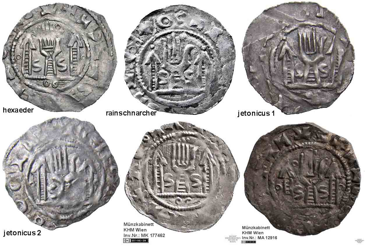 Fünf der sechs vorgestellten Pfennige zeigen unter der Kampszene ein nach rechts gekipptes (liegendes) "S". Die kuriose Ausnahme bildet jenes Exemplar von jetonicus, das anstelle des liegenden "S" einen neunzackigen Stern zeigt.