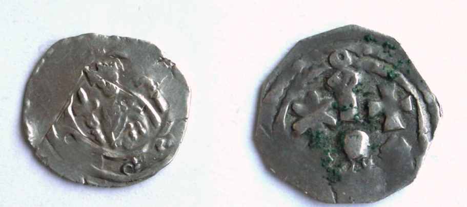 Aber zurück zum Thema. Ich stelle noch ein paar Münzen mit romanischer Architektur aus Pettau (Slowenien) vor. Es sind Gemeinschaftsprägungen von Herzog Leopold VI. und Erzbischof Eberhard II. von Salzburg. Von den Pfennigen gibt es jeweils eine Ausgabe, die sich nur durch die Umschrift, durch die Kopfbedeckung (Herzoghut oder Mitra) und durch die Attribute über den Türmen: 2 Kreuze bei Eberhard, Stern und Kreuz bei Leopold.