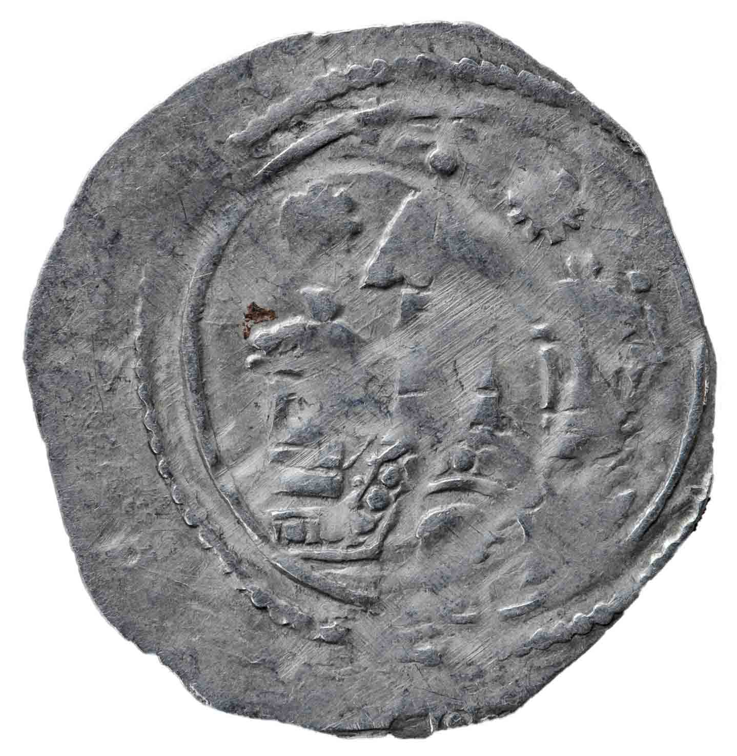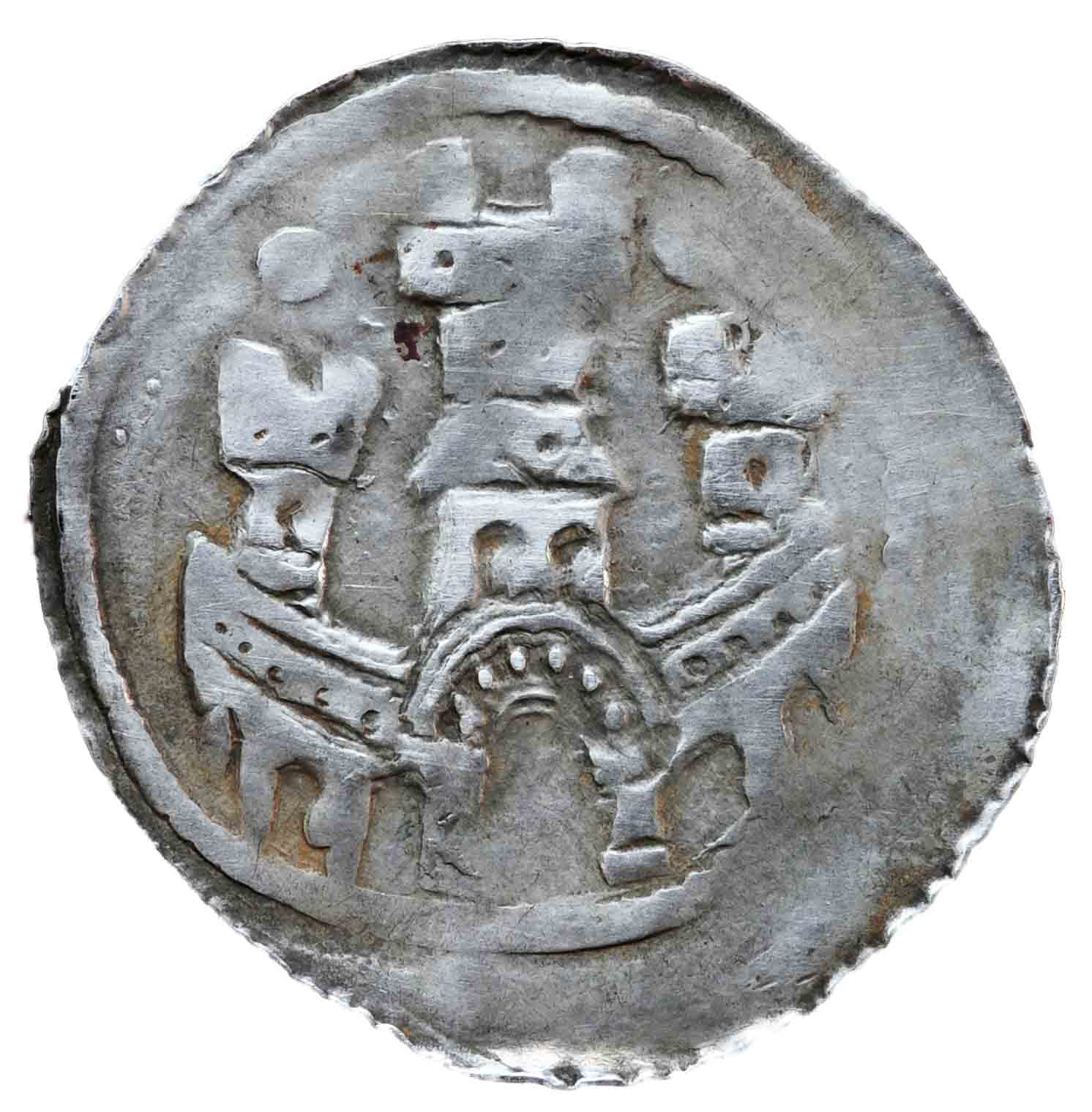 Adalbert III. von Böhmen, 1168-1200. Pfennig, um 1175-1185, Mzst. Salzburg, Laufen. Im doppelten Perlkreis mitriertes Brustbild von vorn, den Kopf nach rechts gewandt, mit Krummstab in der Linken, Buch in der Rechten, darüber Rosette / Dreitürmige Architektur mit Zinnen, über den beiden äußeren Türmen jeweils ein Punkt. 0,96 g. CNA ­­. Hirsch/Hylla Fund Oberteisendorf ­­. Koch ­­.