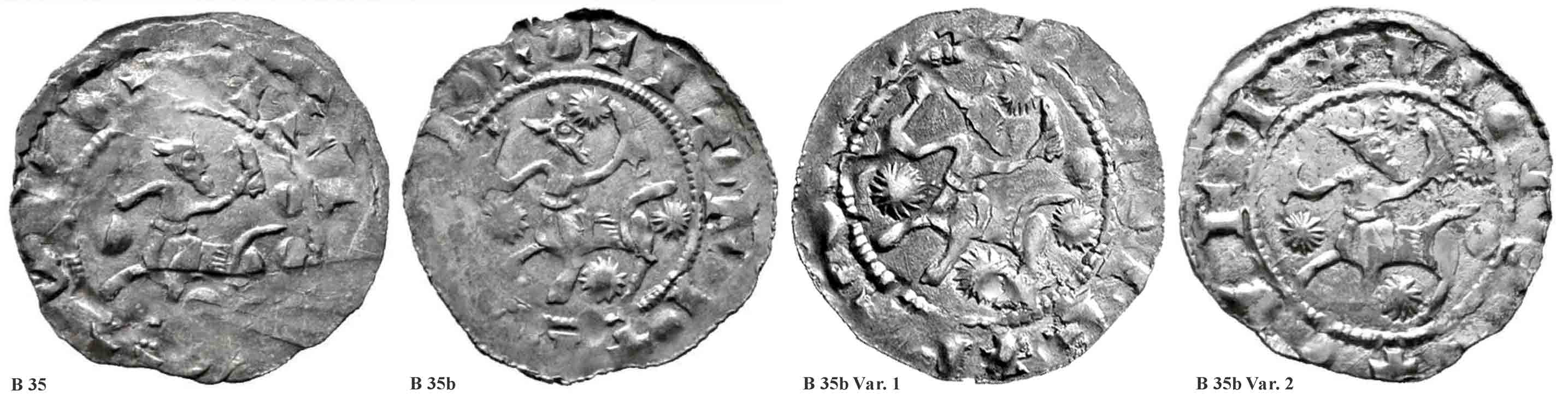 Alle vier gezeigten Stücke unterscheiden sich durch eine unterschiedliche Trugschrift. Der B35 zeigt unter dem gegitterten Bogen ein "A" die anderen drei Pfennige eine Kugel. Interessant ist, dass alle vier Exemplare an der aufragenden Hand, im Bereich der Mittelhand, einen Kreis zeigen (Stigmata?). Bei B35 und B35b Variante 1 zeigt die dargestellte Hand im unteren Bereich zwei Punkte, die beim B35b aber fehlen.