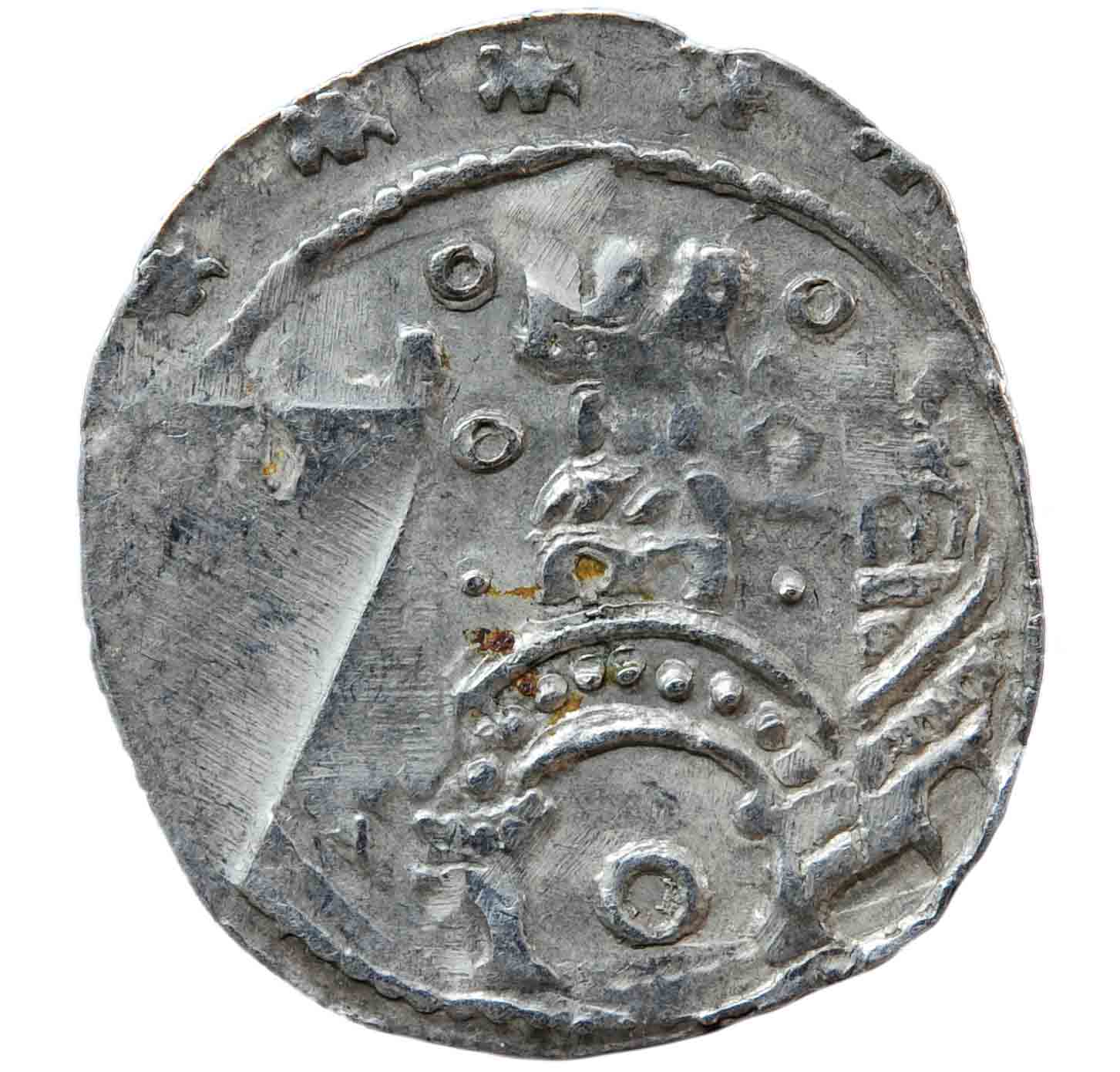 Hier dürfte es eine weitere Stempelkoppelung geben, denn dieses neu vorgestellte Stück zeigt eine weiterte deutlich unterschiedliche Rückseite. Über einem gepunkteten Torbogen, in dessen Zentrum sich ein Ringel (-Beizeichen?) befindet, steht ein Türm mit drei Zinnen. Auf beiden Seiten je ein weiterer zinnenbewehrter Turm, dazwischen je zwei Ringel und ein Punkt als Beizeichen. Statt der Umschrift "+SALZ°PVRC" trägt die nun vorgestellte Münze sechszackige Rosetten zwischen den Perlkreisen am Münzrand.
