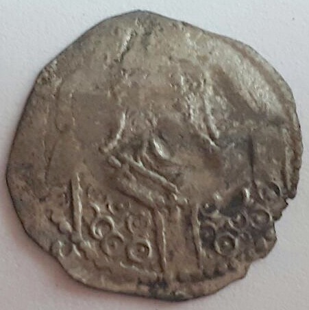 Um zu zeigen, dass das Mittelalter nicht ganz im Dornröschenschlaf versunken ist und die Ritter, bzw. in diesem Fall ihre Geistlichen noch nicht ausgestorben sind, möchte ich noch einen weiteren Pfennig vorstellen, welcher der Münzstätte Laufen zugeordnet wird. Das Stück dürfte ebenfalls aus den Funden in Südbayern stammen, wenige Kilometer nördlich der Landesgrenze von Salzburg/Staatsgrenze von Österreich. Das Stück stammt aus einer Auktion im heurigen Frühjahr und ist mir zuvor in der Form auch noch nicht untergekommen. Der Avers zeigt das leicht seitliche Antlitz des Geistlichen mit Bischofstab in der Linken und Buch in der anderen Hand. Über dem Buch ein achtzackiger Stern/Rosette. Dieses Bild findet sich auch auf den bereits zu Beginn der Seite 5 in diesem Leitfaden verglichenen Pfennigen.