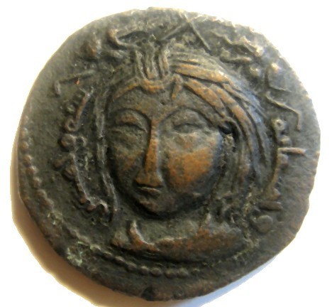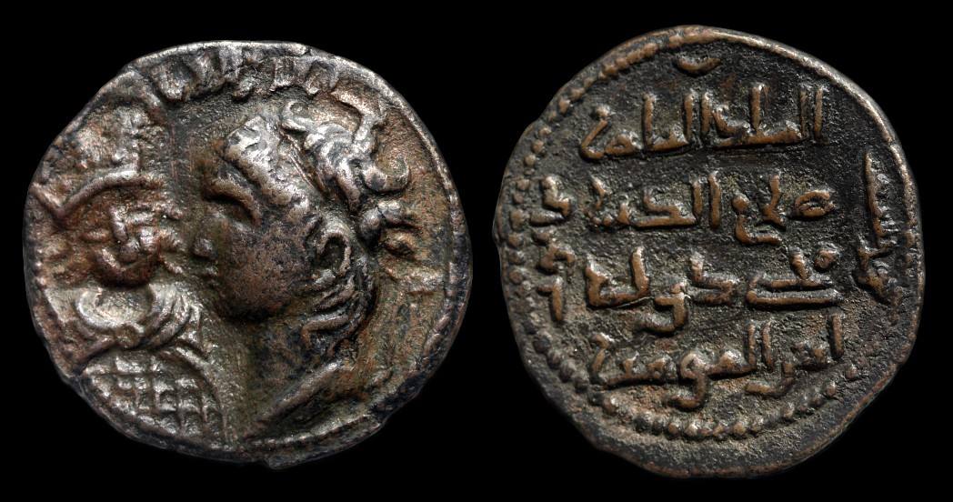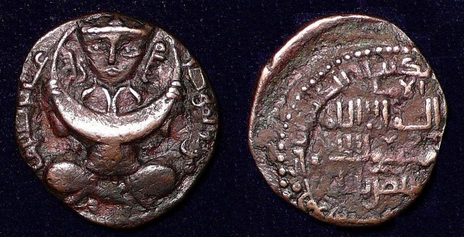 Av. Gekrönte weibliche Büste frontal, in den erhobenen Händen die Mondsichel haltend, die sich über ihrem Kopf zum Kreis schließt. Rv. Im Feld fünfzeilige Legende mit Nennung des Lehnsherrn, des Ayyubiden al-'Adil Abu Bakr (592-615AH); Randschrift: Geprägt in Jazirah sanat sitt was suttuma'en (606 AH ?).