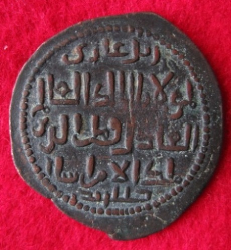 Rv.Legende im Feld la ilah illa allah muhammad / rasul allah al-nasir / li-din allah amir al-mu’ / minin ‘uddat al-dunya wa / ’l-din abu nasr muhammad Kein Gott außer Gott, Mohammed ist der Gesandte Gottes. al-Nasir li-Din Allah, Beherrscher Gläubigen,‘Uddat al-Dunya wa’l-Din (i.e. der künftige Kalif al-Zahir), Vater des Sieges, Muhammad.