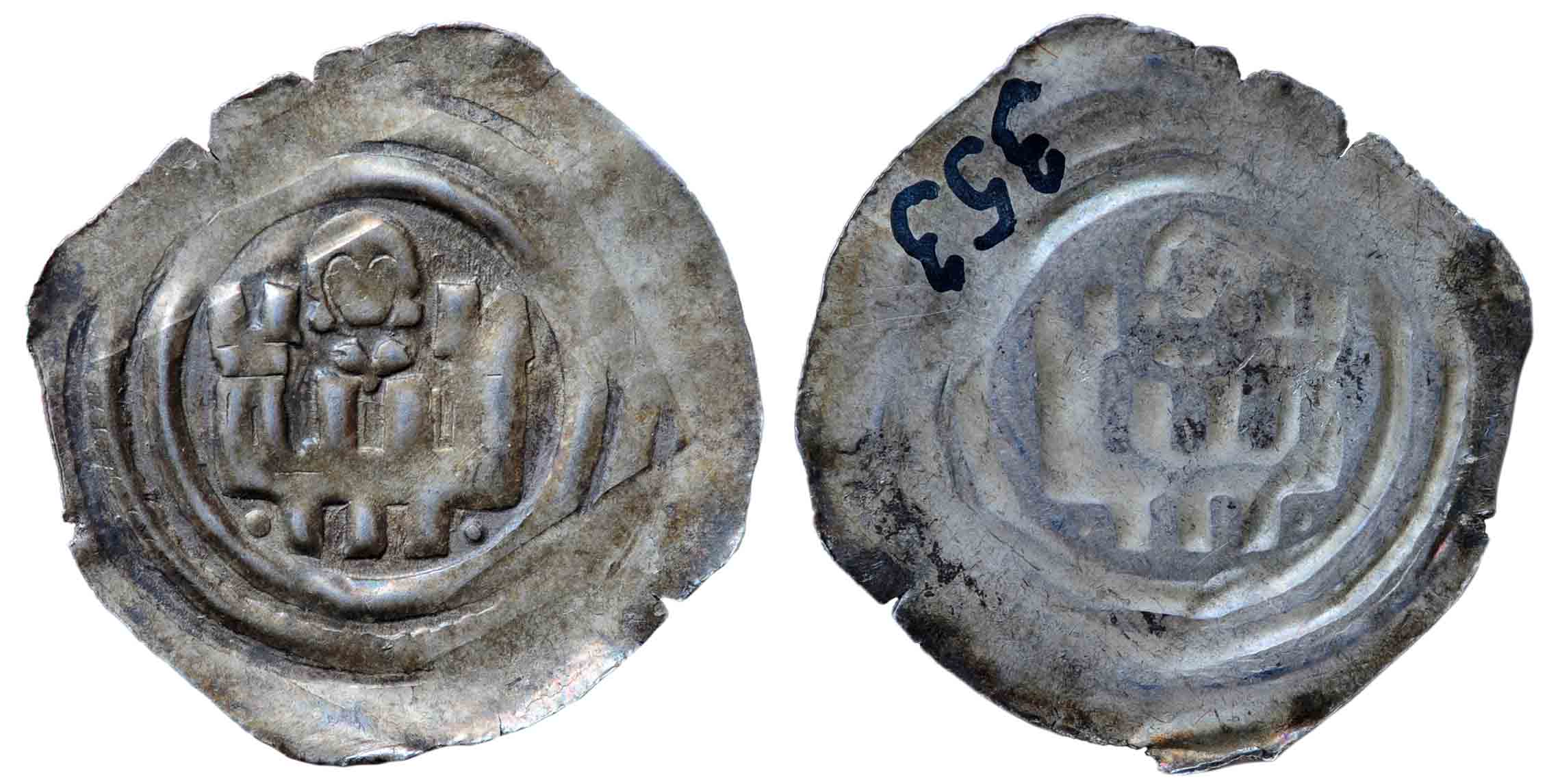 Das erste Bild zeigt einen solchen Brakteaten. Der Rand des Schrötling-Bleches ragte beim Prägen rechts und unten über das Untereisen hinaus, dort ist der Brakteat breiter.