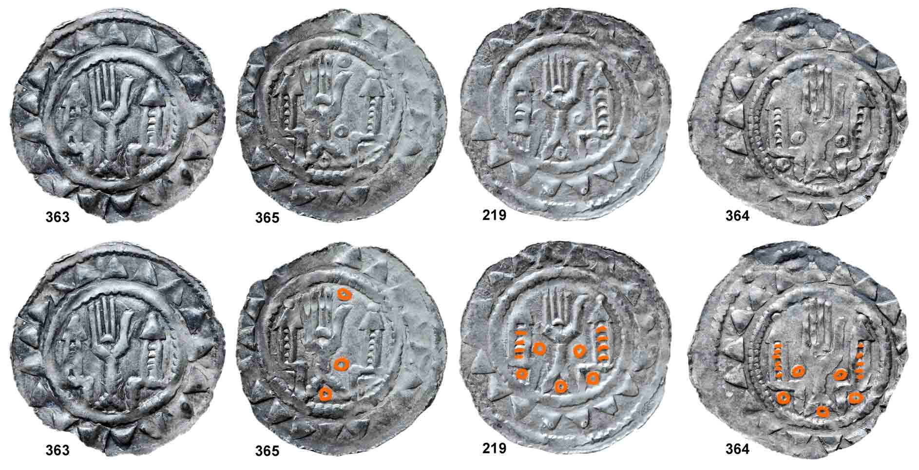 Hierbei dürfte es sich deutlich um Ringel und nicht um Kugeln handeln. Die erste Münze ganz links zeigt keine Beizeichen im Feld. Beim zweiten Pfennig ist die Hand aus der Mitte nach links gerückt und es befinden sich drei Ringel unter bzw. rechts neben der Hand. Der dritte und vierte Pfennig zeigen je 5 Ringel, unter und beidseitig der aufragenden Hand und je ein Ringel im Sockel unter den Türmen. Die beiden rechten Münzen unterscheiden sich durch die Anzahl der Querstriche in den Türmen.