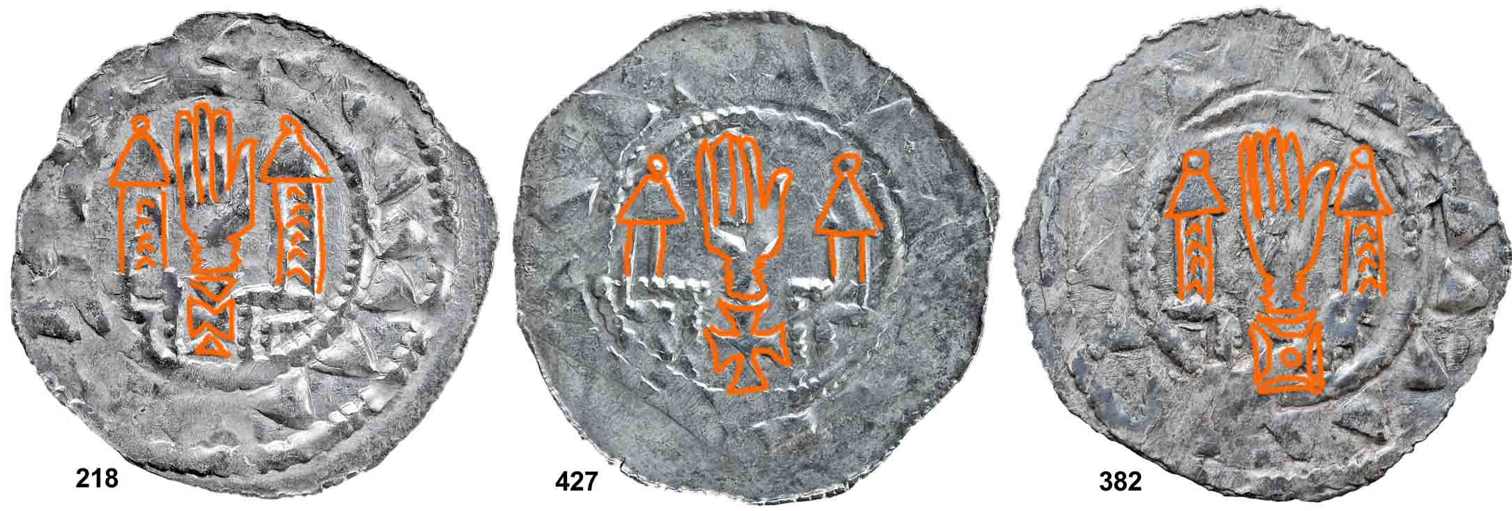 Revers: Bei diesen 3 Belegen zählt die Hand fünf Finger und die Türme zeigen spitze Bögen als Muster. Als Sockel unter der Hand findet sich ein Quadrat aus vier mit den Bögen nach innen gerichteten Halbmonden. Im Zentrum ein Punkt.