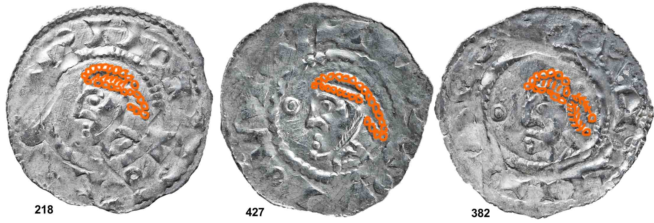 Die Averse der Münzen sind zwar nicht stempelgleich, entsprechen aber im wesentlichen der Beschreibung von Koch. Alle Häupter tragen das selbe kettenähnliche Diadem (?). Vor dem Kopf je ein Ringel mit Punkt im Zentrum. Bei diesem Münztyp unterscheiden sich die Varianten durch Menge und Lage der Ringel-Beizeichen am Revers.