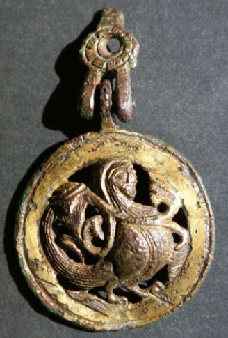 Deiner Scheibe habe ich bei Krabath ("Die hoch- und spätmittelalterlichen Buntmetallfunde nördlich der Alpen") ein adäquates Exemplar gefunden, das zwar viereckig und ohne Löcher ist aber in der Machart (sehr dünnes Pressblech) und vor allem im Motiv Deinem Stück sehr ähnlich ist. Krabath datiert es ins 12. Jahrhundert, Fundort Höxter. Wahrscheinliches Herstellungsgebiet dieser Gegenstände ist - wie auch bei meinen Pferdeschmuckanhängern - das Harzgebiet. Anhand der Fundorte lässt sich erkennen, dass die Stücke entlang des Wasserweges (Donau) bis nach Ungarn verbreitet wurden. Ich vermute, dass Deine Scheibe als Trachtbestandteil zur Verzierung von Lederriemen gedient hat. Dass die Scheibe einmal eine (Brakteat-)Münze war und später mit 2 Löchern versehen als Schmuckscheibe gedient hat, ist möglich aber eher unwahrscheinlich. Eine unserer Schmuckscheiben habe ich übrigens als mein Abzeichen (man muss dazu wohl "Avatar" sagen) gewählt. Sie ist aus Kupfer/Bronce, vergoldet und in Durchbruchsarbeit hergestellt und stellt einen vierfüßigen Greif dar.
