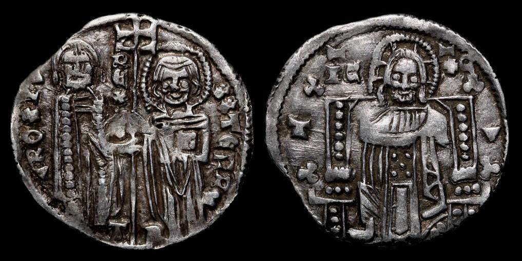 Der Erfolg des Grosso führte zu Beginn des 14. Jahrhunderts zu zahlreichen Nachahmungen des Münzbilds, die meisten davon anonym, da man Strafaktionen seitens Venedig fürchtete. Die serbischen Könige allerdings waren selbstbewußt genug, ihre Namen auf die Kopien zu setzen. Auf Änderungen der Ikonographie verschwendeten sie keine Zeit. Der heilige Markus wurde in den heiligen Stefan umgetauft, hielt aber weiterhin das Evangelium in der Hand, anstatt ihn mit der üblichen Palme des Märtyrers kenntlich zu machen. Der DVX wurde durch den REX ersetzt, die Fahne durch das Patriarchenkreuz. Hier nun ein serbischer Zeitgenosse der beiden Venezianer Dandolo und Soranzo.
