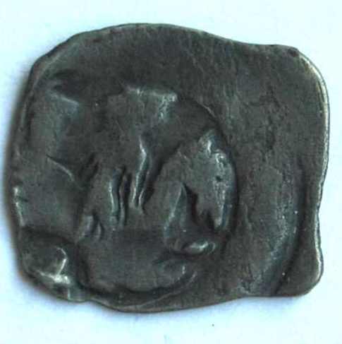Es handelt sich hier um einen Pfennig von Albrecht II. (1330-1358), Münzstätte Wien, CNA B246, Reiter n.r. mit einem Bindenschild in der Rechten, unter dem Pferd ein Kleeblatt. Die Rückseite müsste das Wappen des Münzmeisters Jans von Tierna im Perlkreis zeigen, es ist aber sehr selten zu erkennen. Diese Pfennige sind in guter Erhaltung selten, daher ist die Bestimmung immer schwierig. Die Möglichkeit einer Fälschung oder eines Beischlages besteht daher natürlich auch.