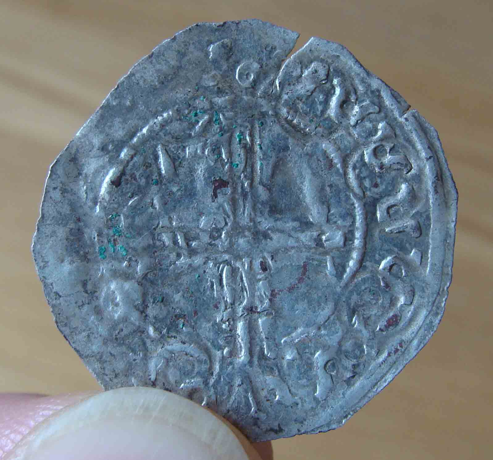Beim Nachschlagen im CNA habe ich auf der Tafel 14, unter den zeitgenössischen Fälschungen (selbstständige Typen) BA, BB und BC sehr ähnliche Stücke angetroffen, die auch vom Durchmesser her gesehen, passen würden. Unterschiedlich wären jedoch die vier kreuzförmig angeordneten Gesichter in den inneren Kreuzwinkeln. Die Münze sollte vom Stil her aus dem 12. Jahrhundert stammen. Ob es sich dabei um eine „zeitgenössische Fälschung“ handelt, oder um eine nicht edierte Münze, kann vielleicht ein Numismatiker definieren? Die Kopfdarstellungen in den Kreuzwinkeln würden mich persönlich eher nicht an eine Fälschung denken lassen. Ob damalige Falschmünzer derartig feine Details in die Stempel geschnitten hätten? :?