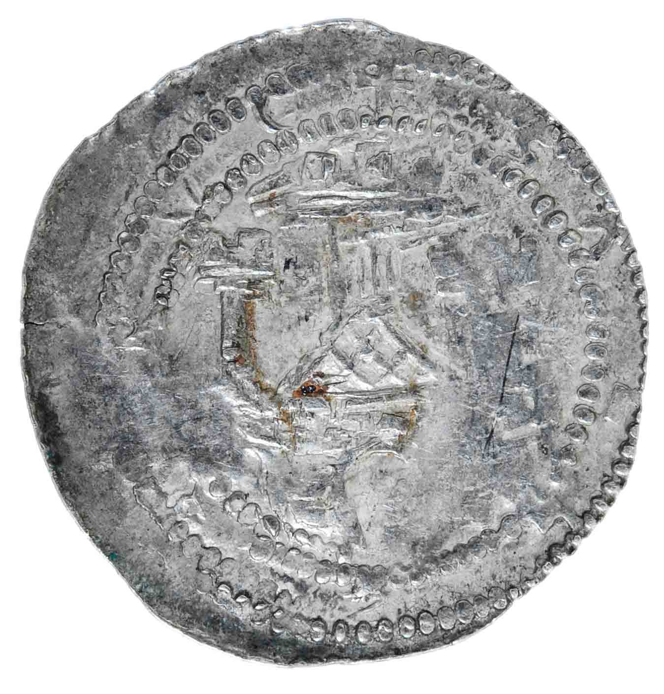 Auf dem Revers ist wiederum ein sehr aufwändig gestaltetes dreiteiliges und mit Zinnen versehenes Wehrgebäude zu beobachten. Bei diesem Stück fehlt allerdings die Umschrift "SALZPURC" zwischen den Perlkreisen. Auch der auf dem Foto zu sehende Strich unter dem Torbogen ist kein Teil von einem "Z".