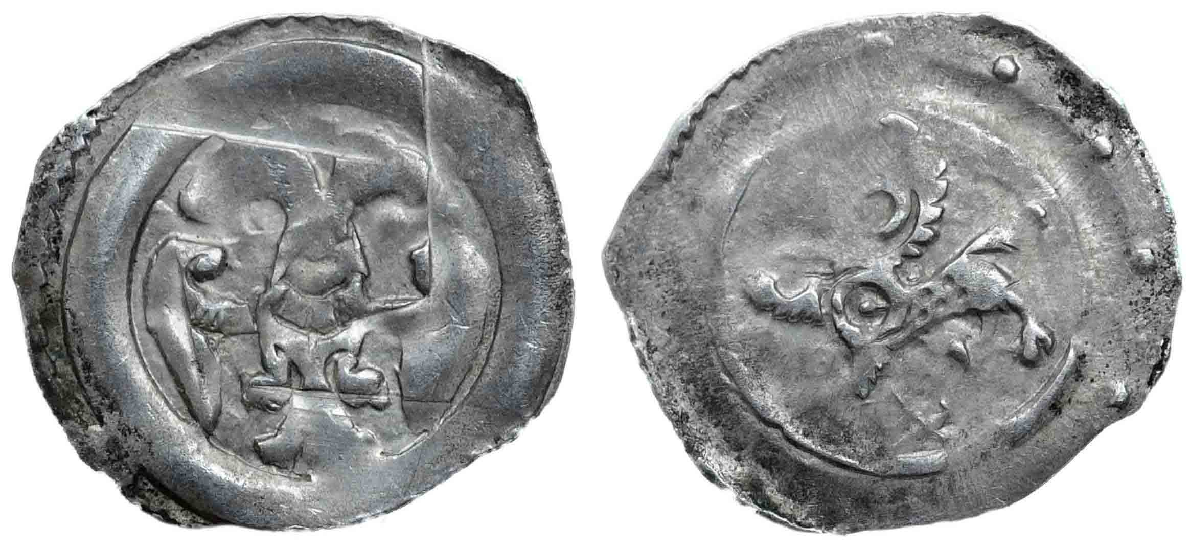 der Pfennig mit dem Stern zwischen den Adlerköpfen ist B 126 a; das Bild der Vorderseite (des Adlers) ist so stark durchgedrückt, daß die Rückseite (Panther) kaum erkennbar ist. Vielleicht kann man, wenn man den Pfennig in der Hand hält und dreht, Spuren des Panthers erkennen, die man auf dem Photo nicht ausmachen kann.