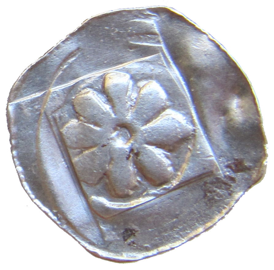 vor kurzem habe ich diese Münze das erste Mal gesehen. Im CNA I wurde ich nicht fündig. Es gibt zwar ein ähnliches Stück mit spitzen Blütenblättern, aber es sieht für mich nicht aus, als wäre es nur ein anderer Stempel.