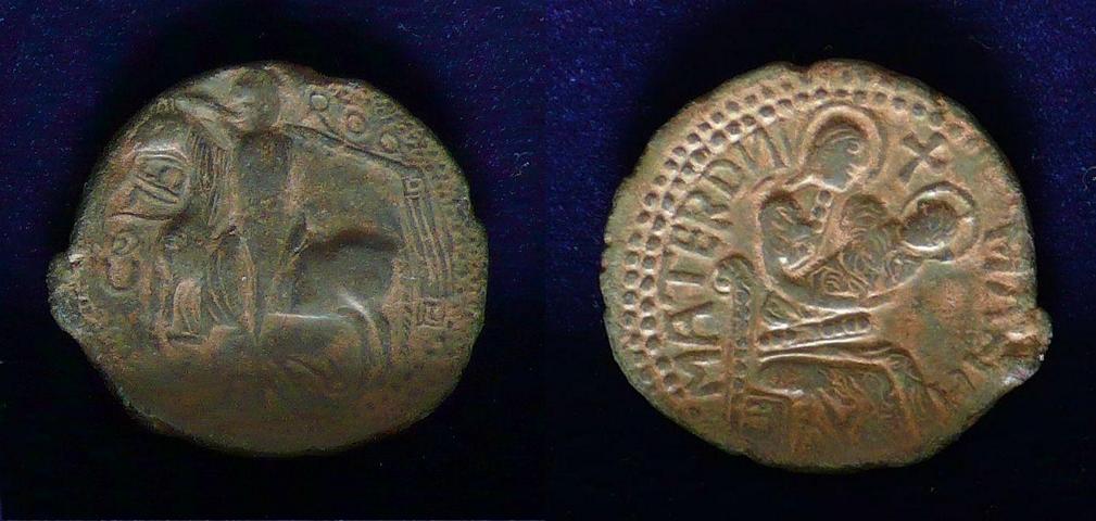 Jedenfalls handelt es sich bei diesem Münztyp um ein Unikum: auch wenn der Rv. beim ersten Hinsehen an Byzanz erinnert, ist (mir) keine einzige byzantinische Münze mit diesem speziellen Maria-Jesuskind-Motiv bekannt.